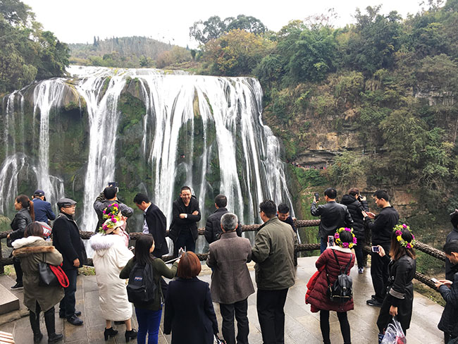 走过满是盆景的黄果树公园,拾级而下,隐隐约约传来瀑布的哗哗声响,明明声音就在附近,但还是走了约半小时。这是一个从远到近,从左到右,从上到下,号称唯一一个360度无死角观看的瀑布。